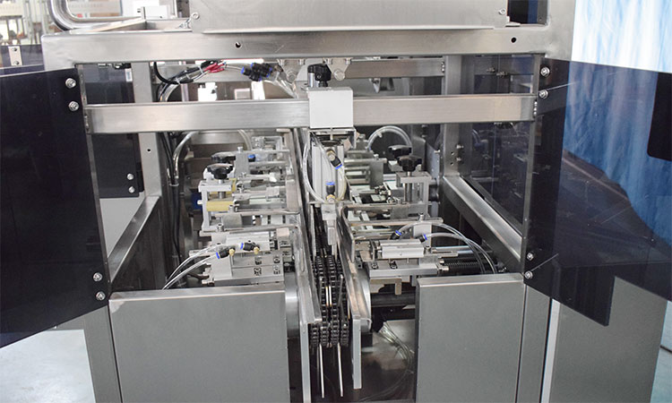 3.開盒:導(dǎo)軌卡位把紙盒固定住,推板推開紙盒,兩個(gè)隨紙盒移動(dòng)的卡板從導(dǎo)軌兩側(cè)升起,從前后方向卡住紙盒的側(cè)面,使盒子打開成直角并前移到裝填區(qū)域。