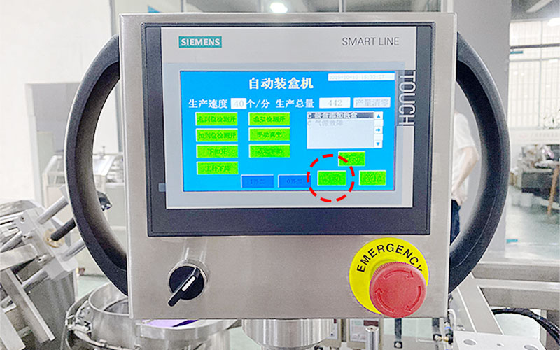 更具有產品進盒不到位或卡料自動停機,缺紙盒自動報警,無產品不開盒,觸摸屏自動顯示故障,并停機報警,顯示機器操作及維修方式。
