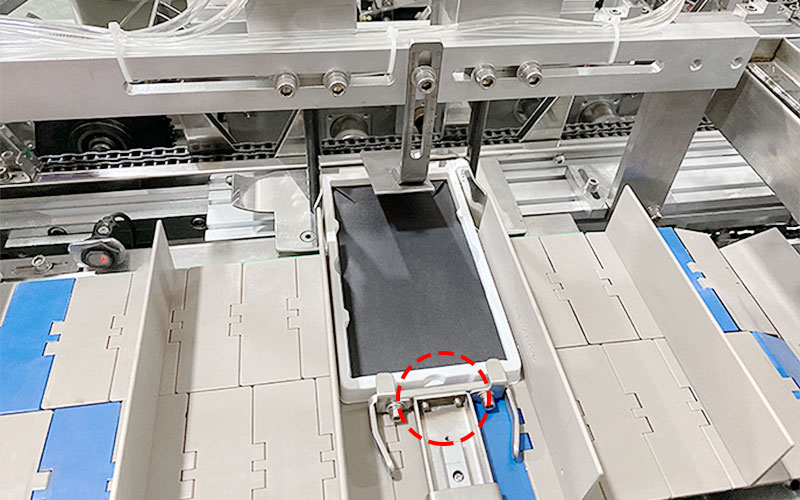 包裝流程:機器傳送帶前端自動下料;再由傳送帶自動送料到達指定位置感應紙板倉自動開盒及進料、折耳、折頁、插盒成型再由后端完成整條生產線工作。